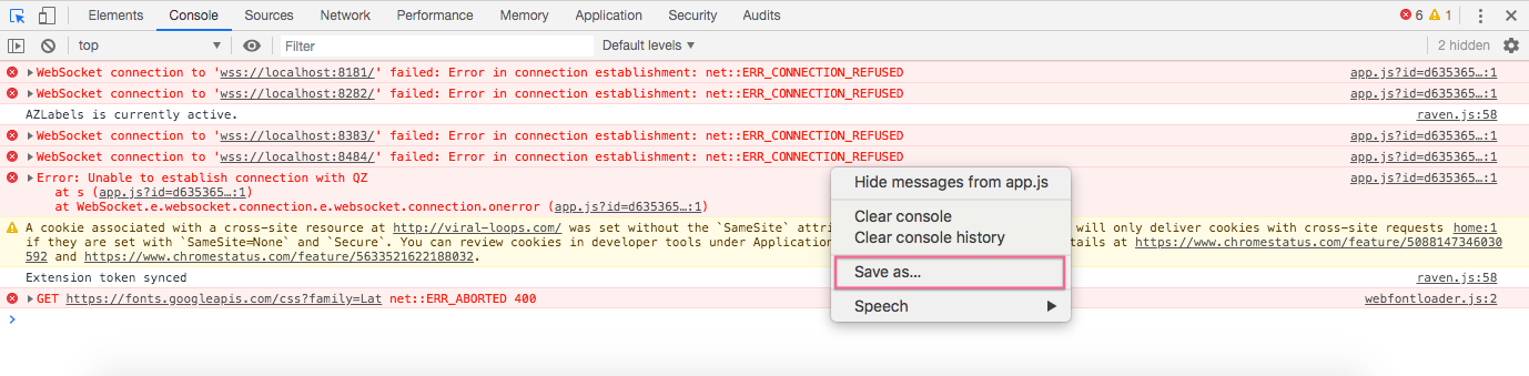 Click the Print Thermal Labels button and then send a copy of the console logs to support@azlabels.com. To save the console logs, right click on the log and click the Save As button.