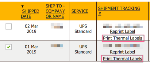 The second is printing labels from your history page. In the list of all your previous shipments, there is a new button underneath the tracking number, titled "Print Thermal Labels". Click that button to print directly from the history.